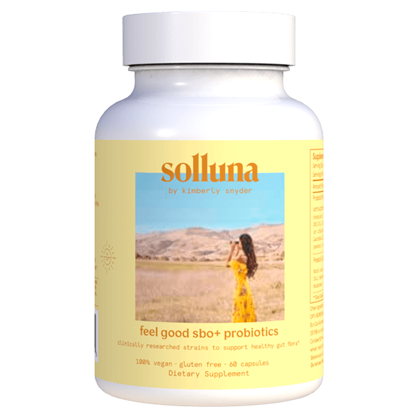 Solluna's Feel Good SBO Probiotics key ingredient benefit description. Non-dairy, vegan-friendly & shelf-stable probiotics for enhanced digestion